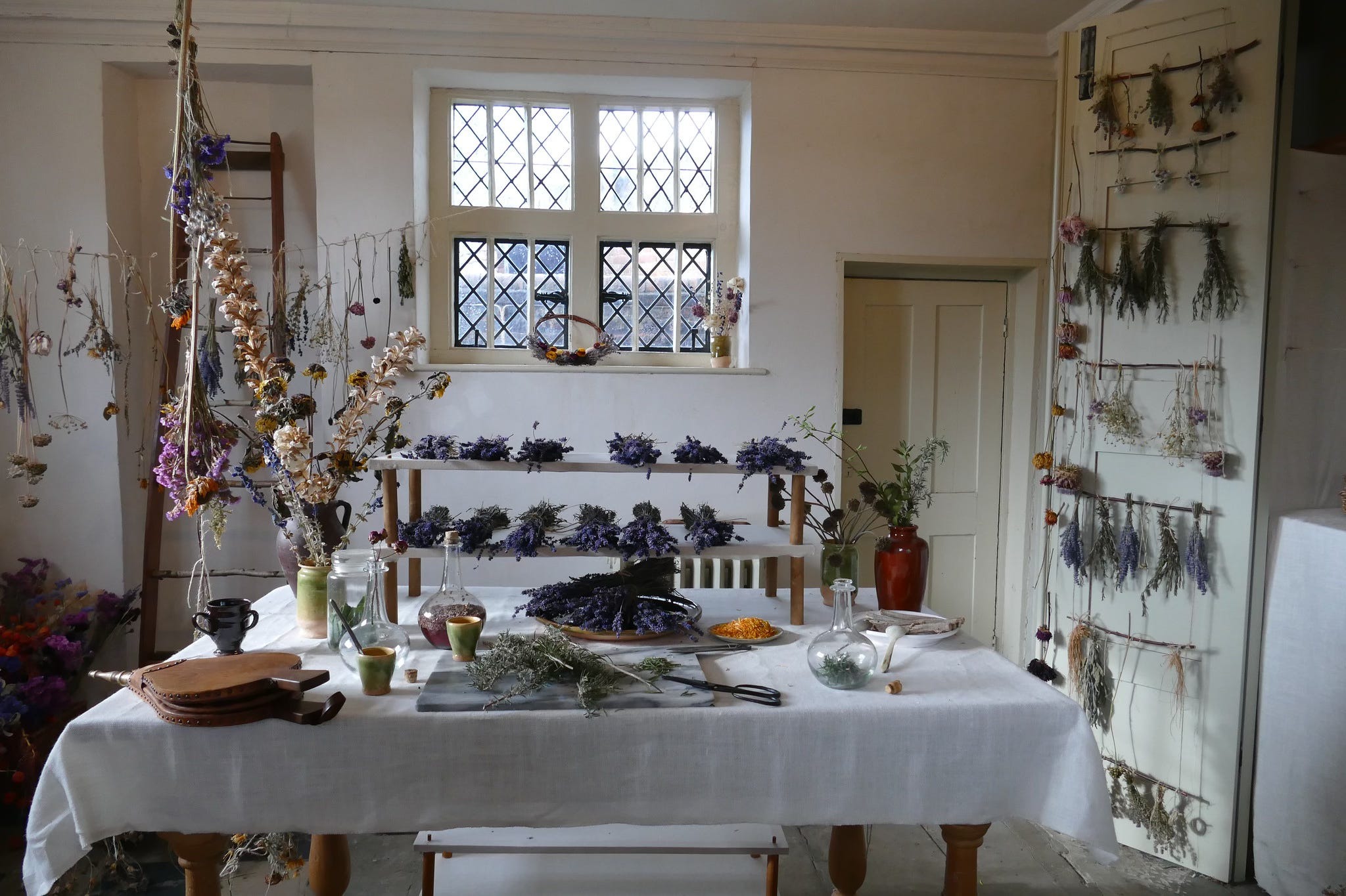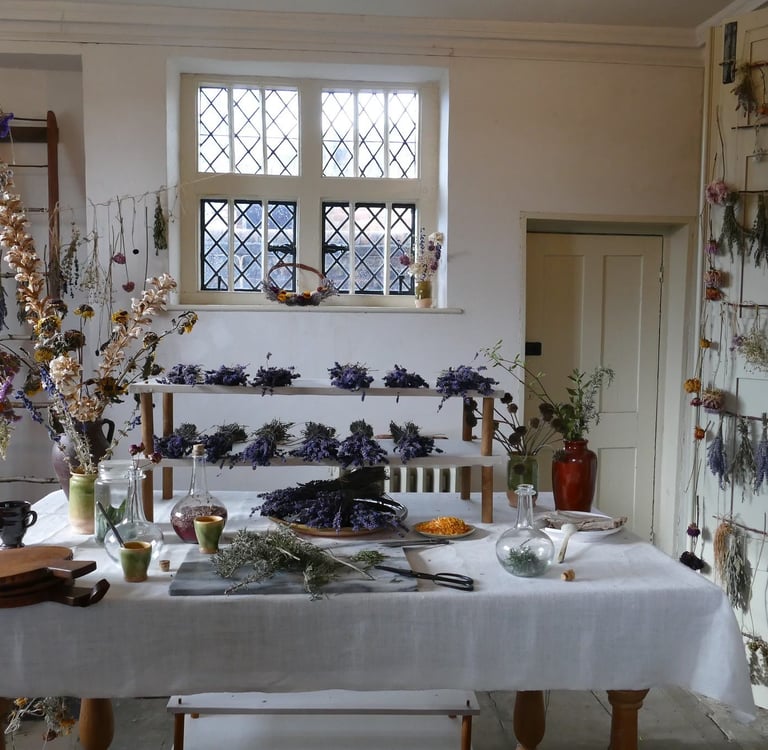 17th-century still room at Ham House, England - the still room was a working room, part chemistry lab, part compounding pharmacy, part perfumery, part beverage factory, and part kitchen.