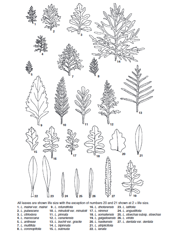 The diversity of leaf shapes and forms found within the genus Lavandula. Source: Lis-Balchin, M. (Ed.). (2002). Lavender: the genus Lavandula. CRC Press.